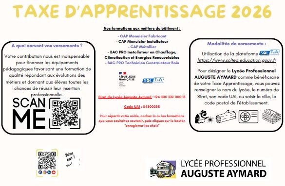Le Lycée Professionnel AUGUSTE AYMARD, est habilité à percevoir la taxe d'apprentissage au titre de l'année 2026.